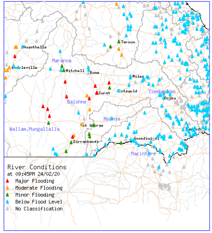 Image 1: Southern QLD river conditions on Tuesday, February 25th 2020 via the Bureau of Meteorology.