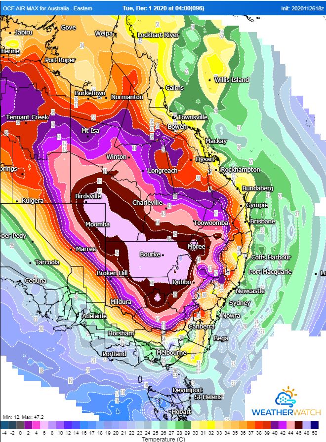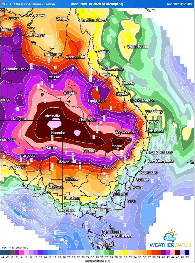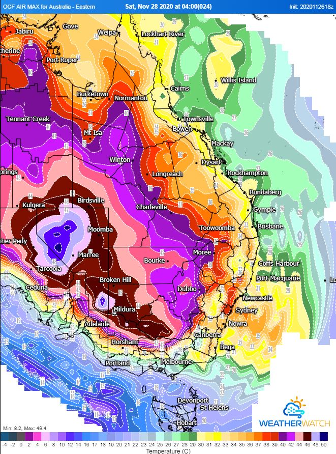 Many locations across inland South Australia, New South Wales, Queensland, Northern Victoria and parts of the Northern Territory will see temperature soar into the 40's. The Operational Consensus Forecast even has a small area of 50°C being reached in Central South Australia. Whilst this isn?t likely, mid to high 40's is expected. Adelaide is expecting a top of 40°C today, 38°C on Saturday before a cool change move through the state.