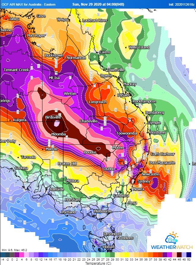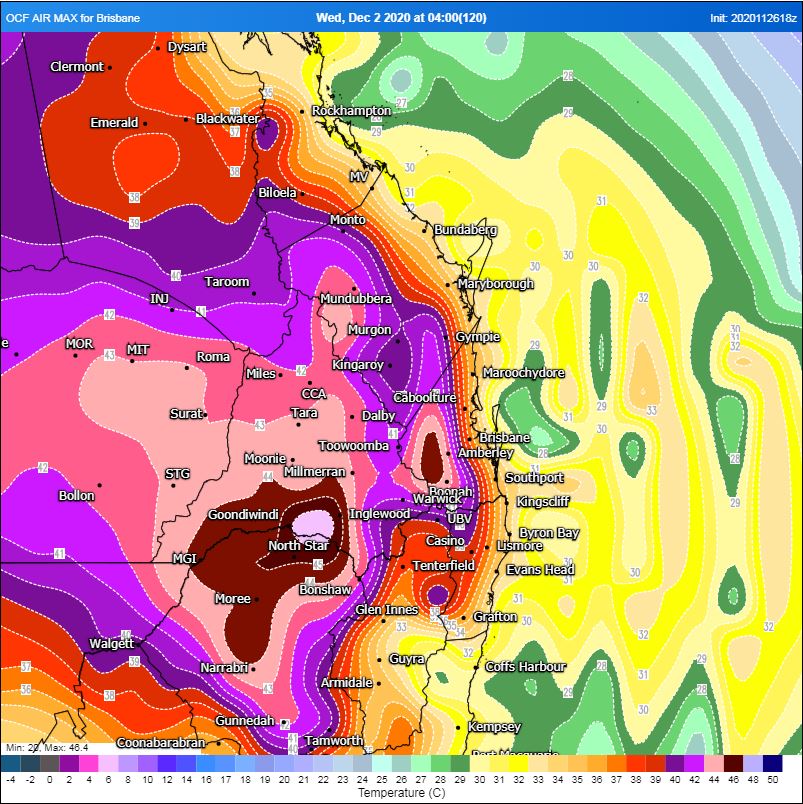 Temperatures will soar across the capital cities, with Brisbane expecting 33°C Sunday, 32°C Monday, 33°C, Tuesday before a scorcher on Wednesday topping out at 37°C. Western parts of South East QLD may seen temperatures into the low 40's, with parts of the Darling Downs into the mid 40's.