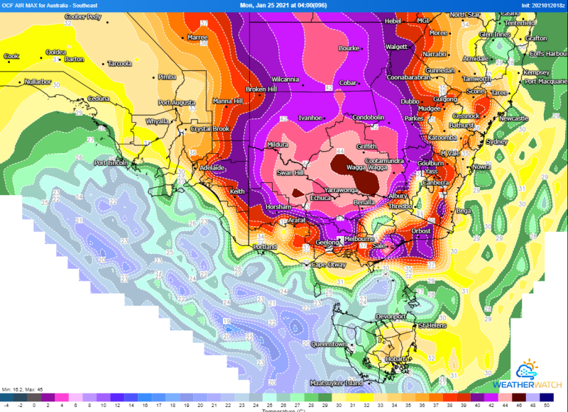 On Friday, temperatures will start reaching the mid 40s over northern SA, before these temperatures begin affecting more southern parts of the state on Sunday, as well as northern VIC and southern inland and western NSW. Saturday and Sunday will be Adelaide's hottest days of the spell (with seabreezes keeping other days cooler) and is forecast to reach 39 degrees on Saturday and 41 degrees on Sunday. Renmark is forecast to hit 40 degrees on Saturday and 44 degrees on Sunday, whilst Mildura reaches 40 degrees on Saturday and 44 degrees on Sunday.