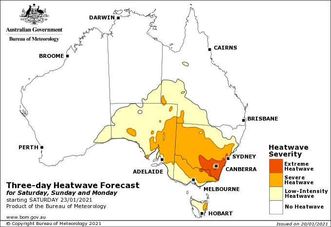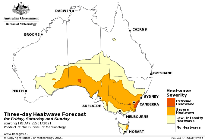 Image 2: Bureau of Meteorology heatwave forecast map from Friday 22nd January to Sunday 24th January, 2021