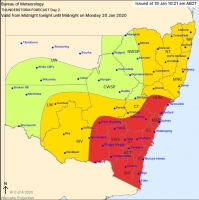 Fire danger spiking over southeast Australia, but rain to follow22 January 2020: A strong cold front is dragging a hot airmass and strong winds once again over southeastern Australia causing dust storms and fire danger to reach severe to extreme levels, however rain is thankfully on the way in the wake of the change. |