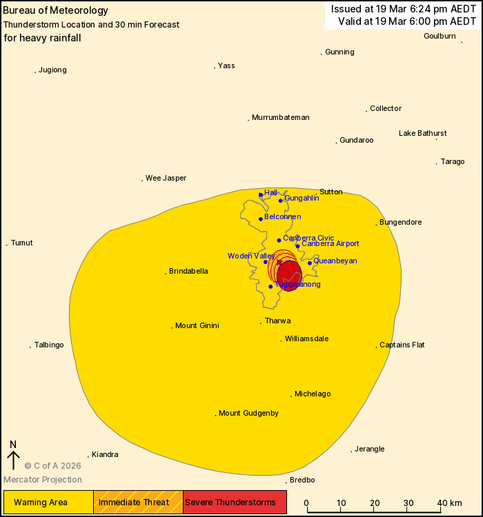 The Bureau of Meteorology warns that, at 6:00 pm, a severe thunderstorm likely to produce heavy rainfall that may lead to flash flooding was detected near Hume. This thunderstorm is slow moving. It is forecast to affect South Canberra by 6:30 pm.