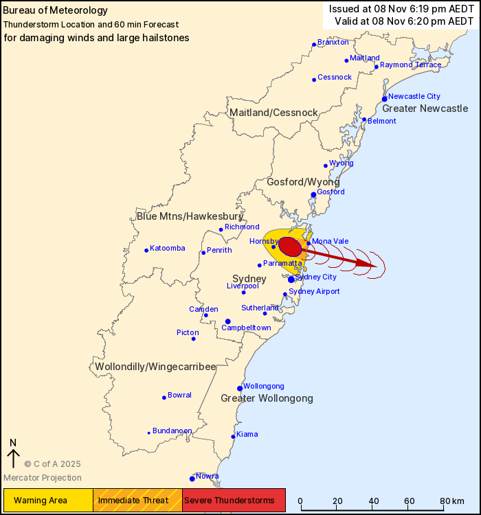 The Bureau of Meteorology warns that, at 6:20 pm, a severe