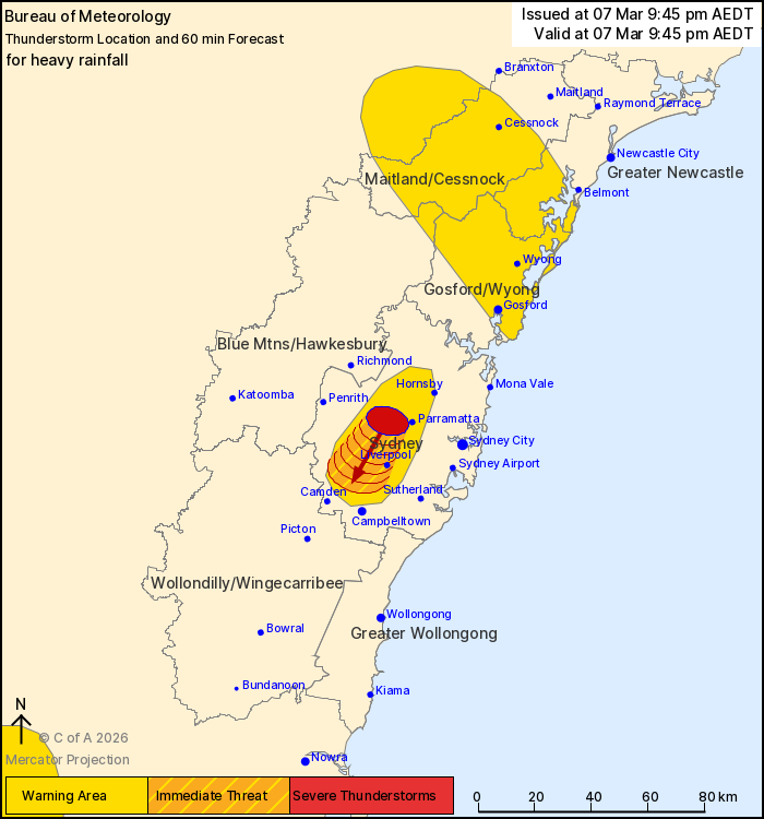 The Bureau of Meteorology warns that, at 9:45 pm, a severe