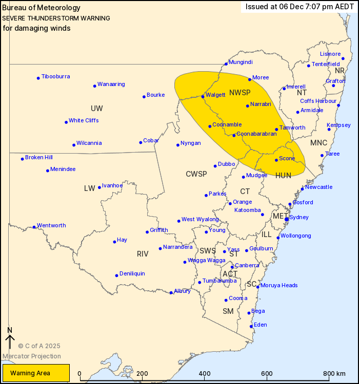Severe thunderstorms are likely to produce damaging winds in the warning area over the next several hours. Locations which may be affected include Tamworth, Moree, Scone, Narrabri, Walgett, Coonabarabran, Coonamble, Gunnedah, Lightning Ridge, Collarenebri, Barrington Tops and Muswellbrook.