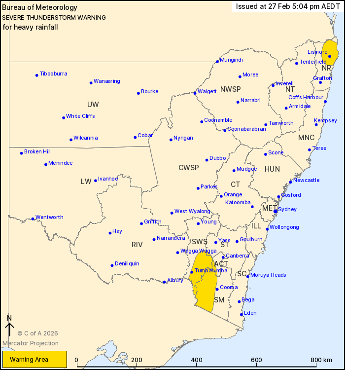 hours. Locations which may be affected include Lismore, Tumbarumba,