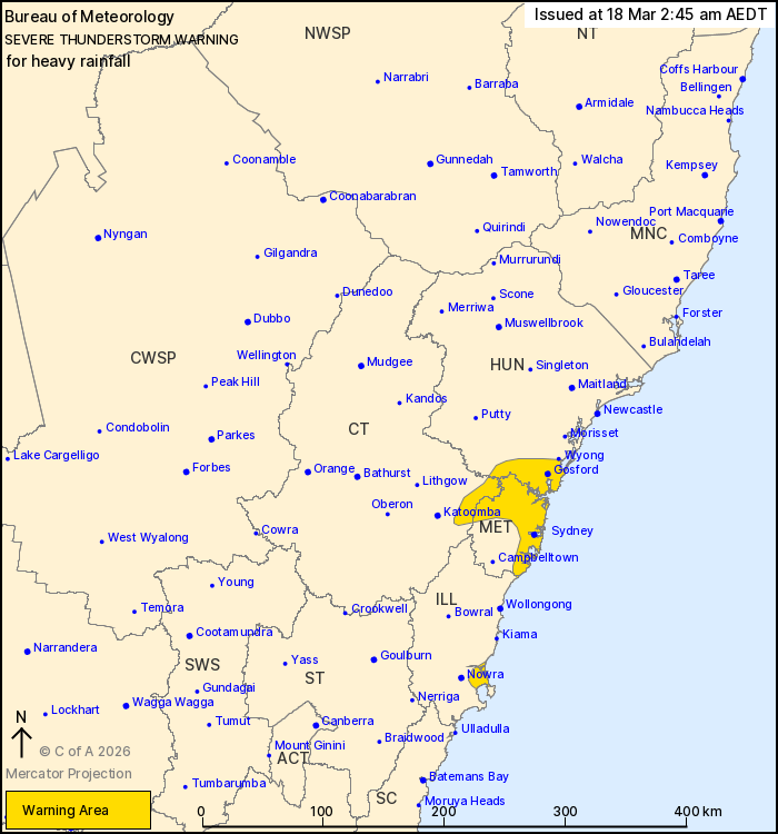 Severe thunderstorms are likely to produce heavy rainfall that may lead to flash flooding in the warning area over the next several hours. Locations which may be affected include Gosford, Sydney, Penrith, The Entrance, Woy Woy and Springwood.