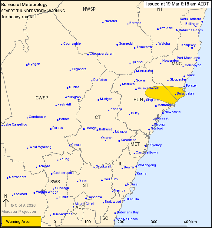 Locally heavy rainfall about the northern Hunter.