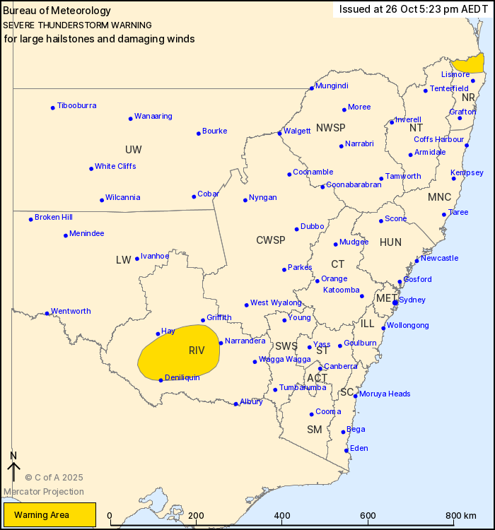 Severe thunderstorms are likely to produce large hailstones and damaging winds in the warning area over the next several hours. Locations which may be affected include Deniliquin, Tweed Heads, Murwillumbah, Mullumbimby, Brunswick Heads and Hastings Point.