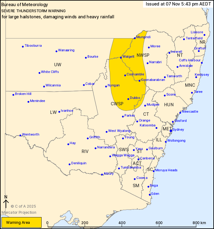Severe thunderstorms are likely to produce large hailstones, damaging winds and heavy rainfall that may lead to flash flooding in the warning area over the next several hours. Locations which may be affected include Dubbo, Walgett, Mungindi, Coonabarabran, Coonamble and Lightning Ridge.