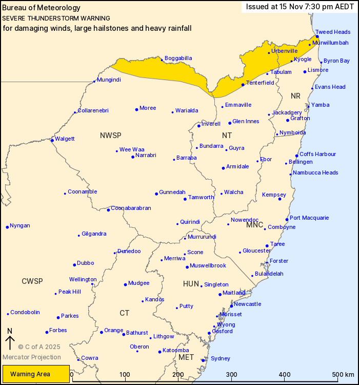 Severe thunderstorms are likely to produce damaging winds, large hailstones and heavy rainfall that may lead to flash flooding in the warning area over the next several hours. Locations which may be affected include Tenterfield, Tweed Heads, Murwillumbah, Kyogle, Urbenville and Boggabilla.