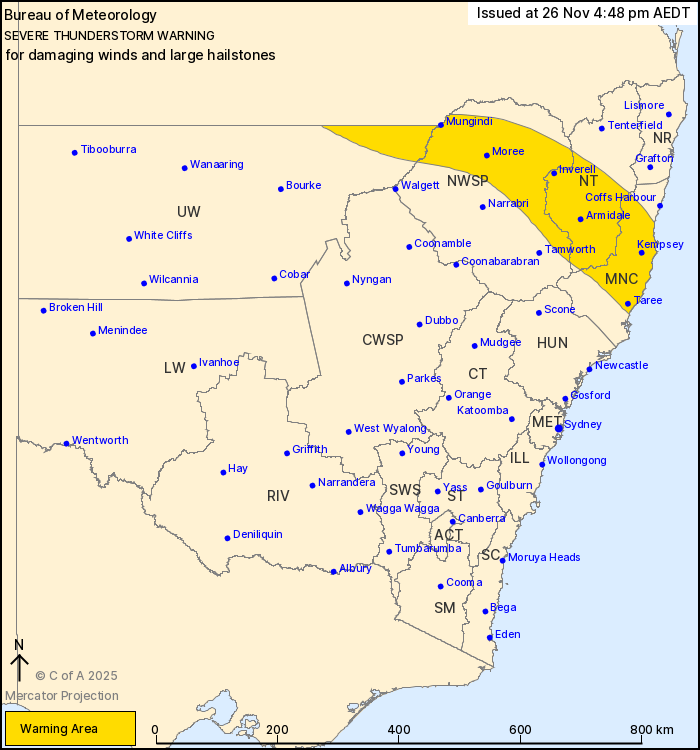 Severe thunderstorms are likely to produce damaging winds and large hailstones in the warning area over the next several hours. Locations which may be affected include Taree, Armidale, Moree, Port Macquarie, Kempsey and Inverell.