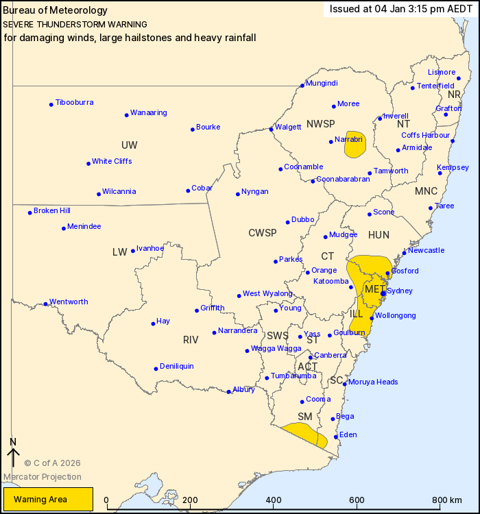 Severe thunderstorms are likely to produce damaging winds, large hailstones and heavy rainfall that may lead to flash flooding in the warning area over the next several hours. Locations which may be affected include Gosford, Sydney, Wollongong, Penrith, Parramatta, Bowral, Campbelltown, Bombala, Wyong, The Entrance, Woy Woy and Kulnura.