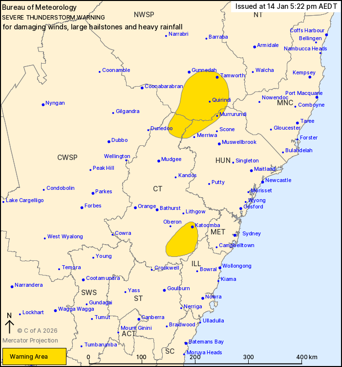 Severe thunderstorms are likely to produce damaging winds, large hailstones and heavy rainfall that may lead to flash flooding over the next several hours in parts of the Hunter, Central Tablelands and North West Slopes and Plains districts. Locations which may be affected include Tamworth, Murrurundi and Quirindi.