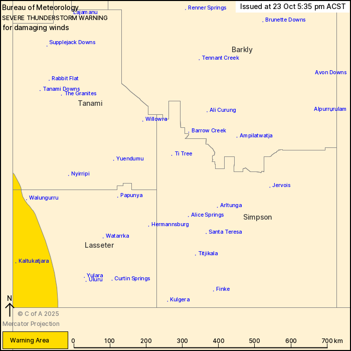 Severe thunderstorms are likely to produce damaging winds in the warning area over the next several hours. Locations which may be affected include Kaltukatjara.