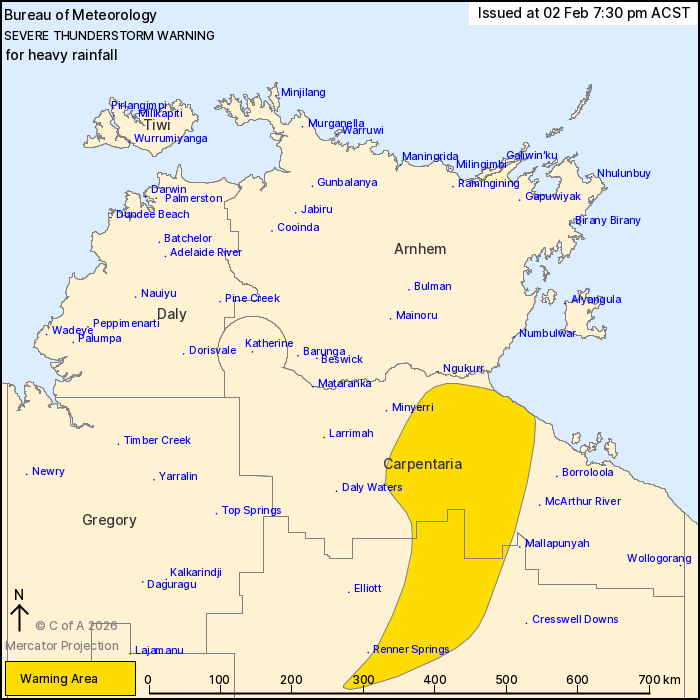 A Severe Weather Warning and Flood Watch/Warnings are also current in the Northern Territory. See https://www.bom.gov.au/weather-and-climate/warnings-and-alerts for the latest information.