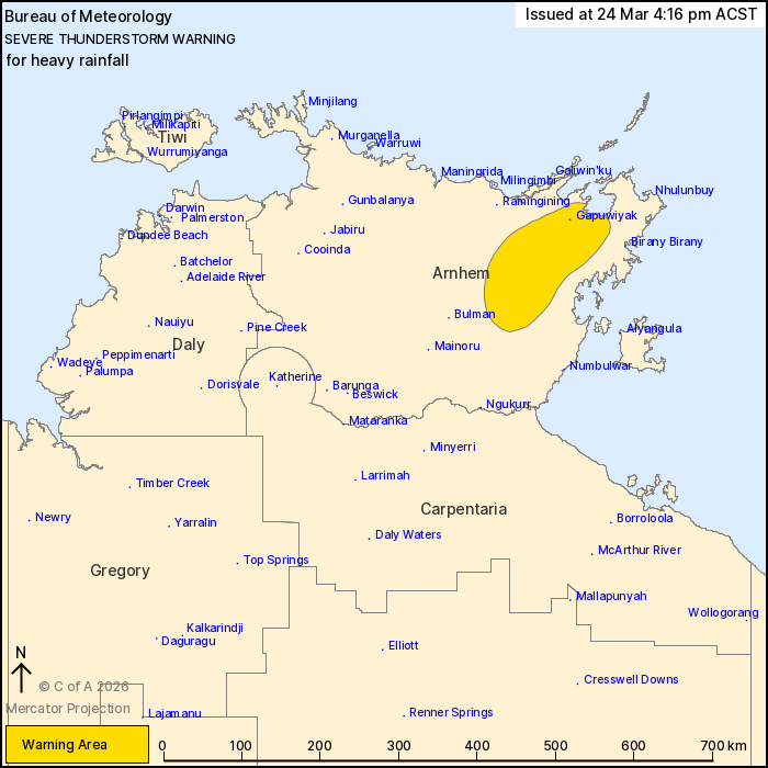 Severe thunderstorms are likely to produce heavy rainfall that may lead to flash flooding in the warning area over the next several hours. Locations which may be affected include Gapuwiyak and Arnhem District south of Ramingining.