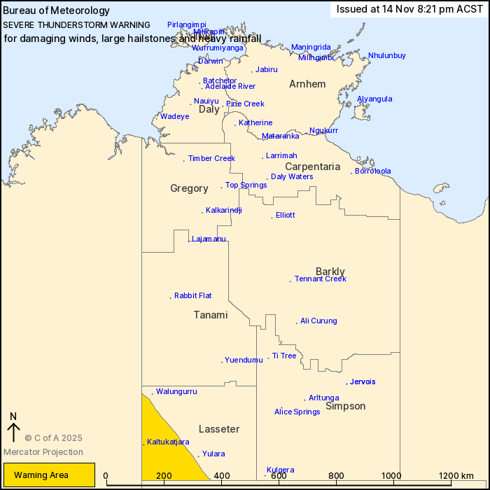 Severe thunderstorms are likely to produce damaging winds, large hailstones and heavy rainfall that may lead to flash flooding in the warning area over the next several hours. Locations which may be affected include Kaltukatjara.