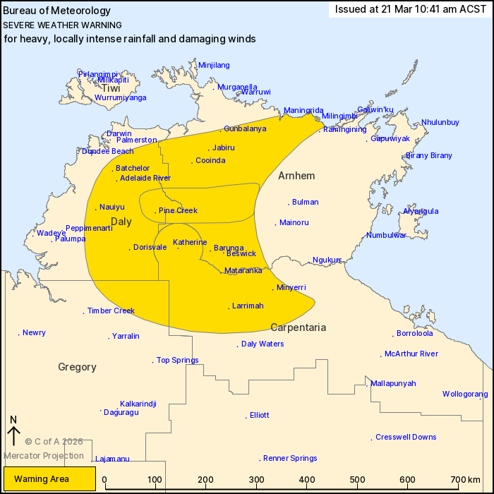 Locally INTENSE RAINFALL which may lead to DANGEROUS AND LIFE-THREATENING FLASH FLOODING is also possible north of Katherine from Sunday afternoon with six-hourly rainfall totals up to 180 mm. 24-hourly rainfall totals of around 350 mm are possible.