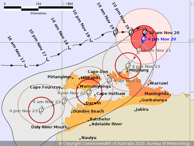 Warruwi on Friday as the system nears the coast, extending to the