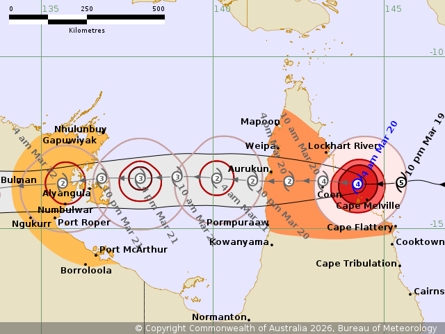 Gales with DAMAGING WIND GUSTS to 120 km/h are likely from Cape Flattery to north of Lockhart River. Gales with DAMAGING WIND GUSTS to 120 km/h are also forecast to extend across Cape York Peninsula, including areas between Mapoon and Pormpuraaw, during Friday.
