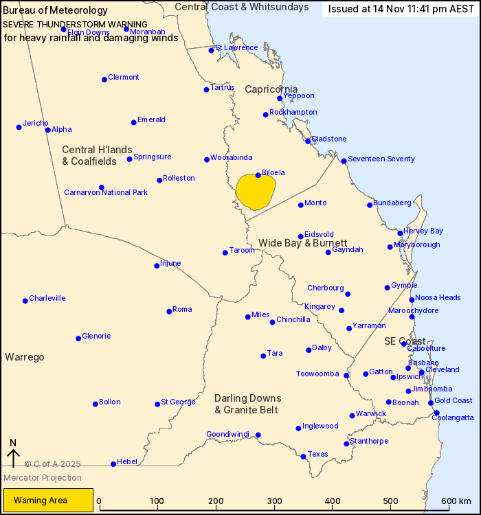 Severe thunderstorms continuing south of Biloela