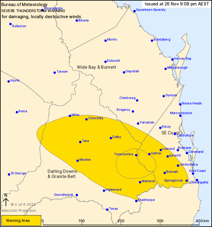 TOWARDS TOOWOOMBA, LOCALLY DESTRUCTIVE WINDS POSSIBLE.