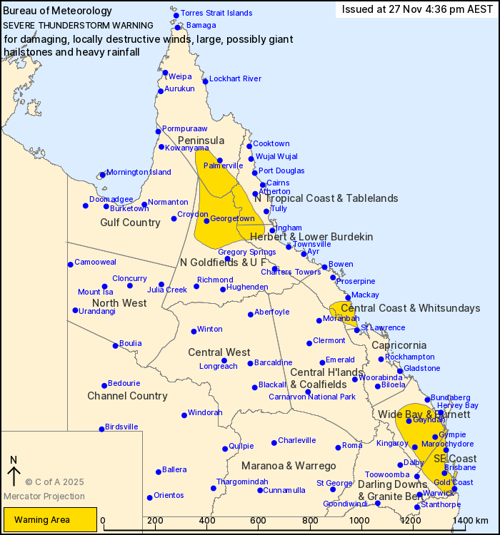 Other severe thunderstorms likely to produce damaging winds, large hailstones and heavy rainfall that may lead to flash flooding were detected near Strathpine, the ranges south of Gayndah and Linville. These thunderstorms are moving towards the east to northeast. They are forecast to affect Redcliffe, Jimna and Brisbane Airport by 4:55 pm and the area south of Esk, southern waters of Moreton Bay and Mud Island by 5:25 pm.