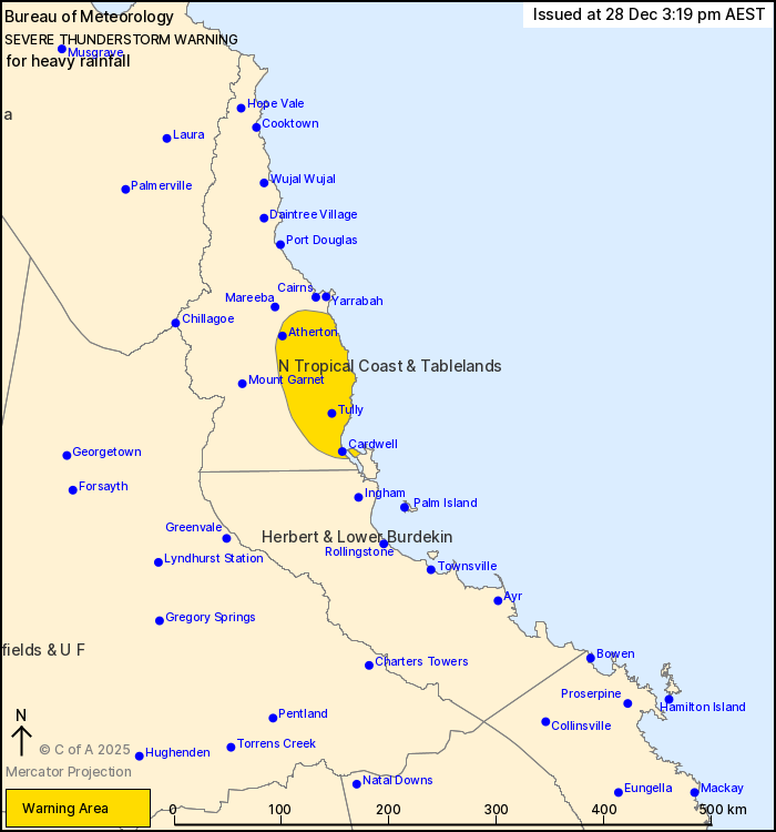 Severe thunderstorms are likely to produce heavy rainfall that may lead to flash flooding in the warning area over the next several hours. Locations which may be affected include Cardwell, Atherton, Tully, Innisfail, Ravenshoe and Gordonvale.