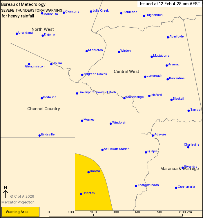 Severe thunderstorms are likely to produce heavy rainfall that may lead to flash flooding in the warning area over the next several hours. Locations which may be affected include Ballera, Orientos and Nappa Merrie.