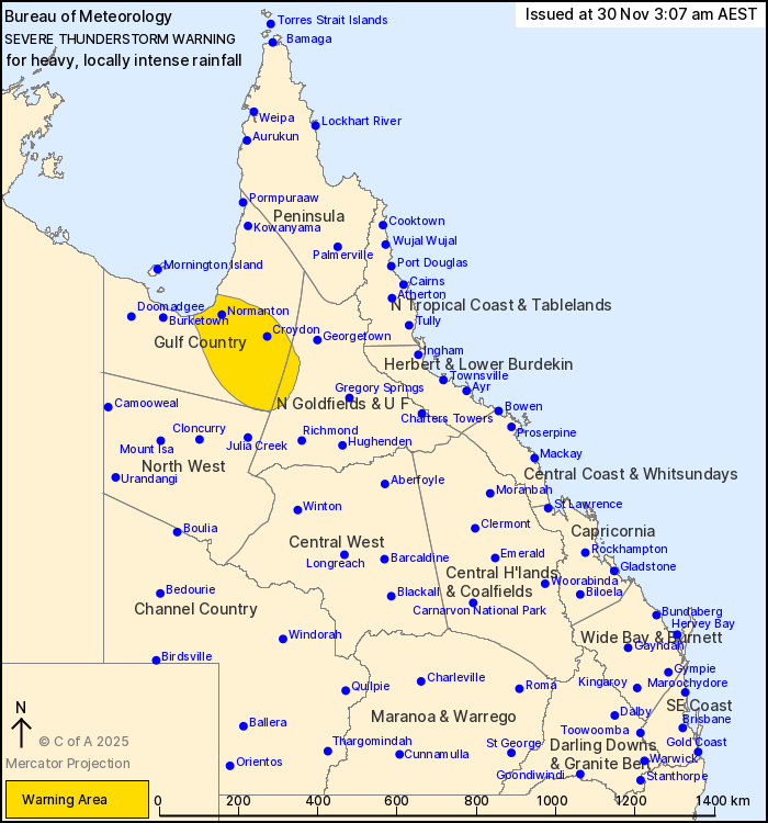 Weather Situation: Slow moving thunderstorms in a very moist environment in the Gulf Country are producing heavy to intense rainfall. Thunderstorms in the Wide Bay and Burnett are continuing but have eased and are no longer severe.