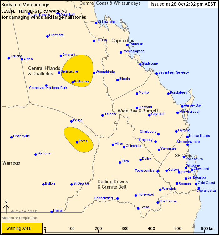 Locations which may be affected include Roma, Blackwater, Rolleston