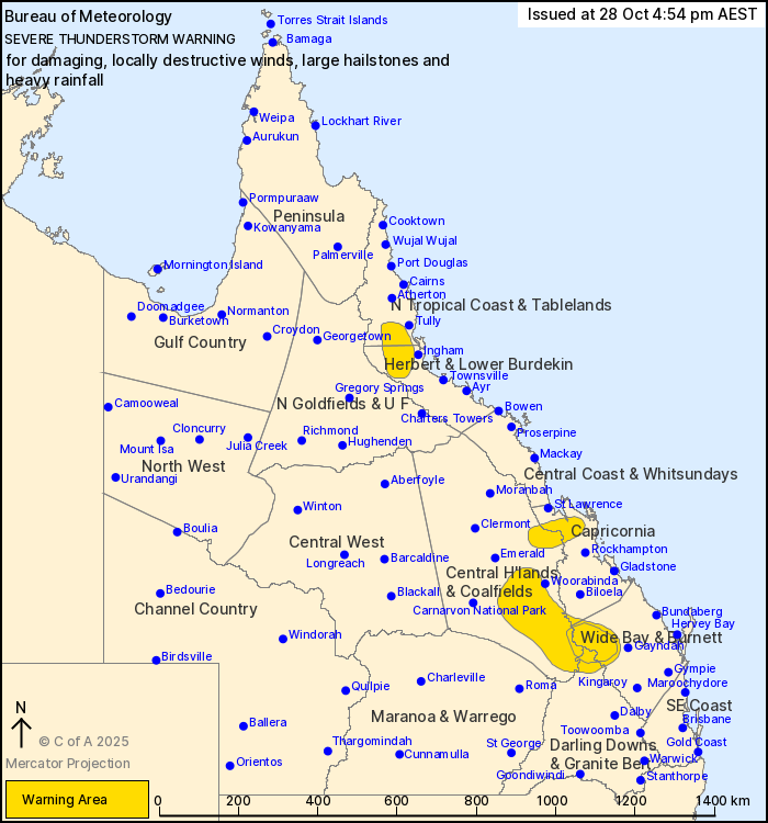 Severe thunderstorms are likely to produce damaging winds, large hailstones and heavy rainfall that may lead to flash flooding over the next several hours in parts of the North Tropical Coast and Tablelands, Herbert and Lower Burdekin, Central Highlands and Coalfields, Capricornia, Wide Bay and Burnett and Darling Downs and Granite Belt districts. Locations which may be affected include Taroom, Rolleston, Marlborough, Abergowrie, Mundubbera and Eidsvold.