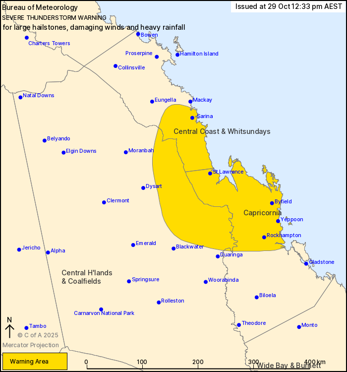 Severe thunderstorms are likely to produce large hailstones, damaging winds and heavy rainfall that may lead to flash flooding in the warning area over the next several hours. Locations which may be affected include Rockhampton, Yeppoon, St Lawrence, Sarina, Byfield and Marlborough.