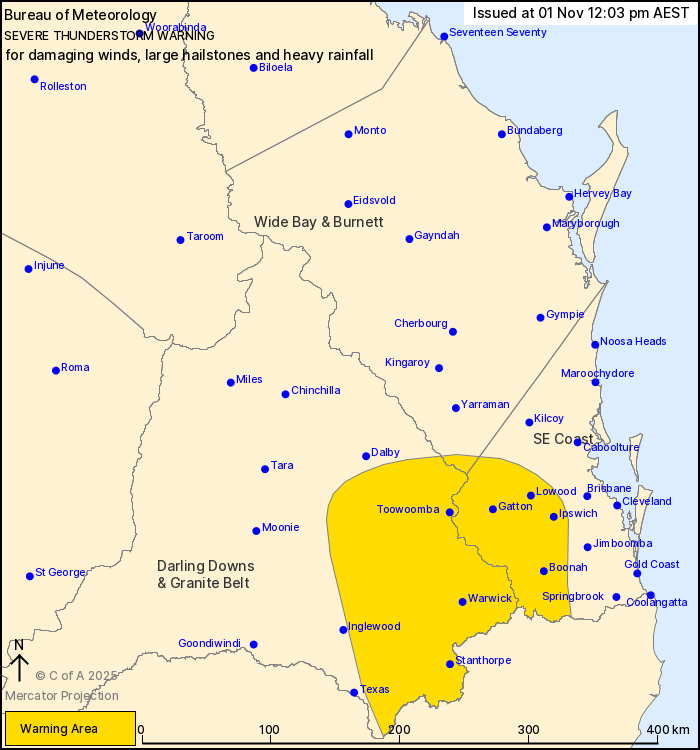 be affected include Warwick, Toowoomba, Ipswich, Gatton, Stanthorpe