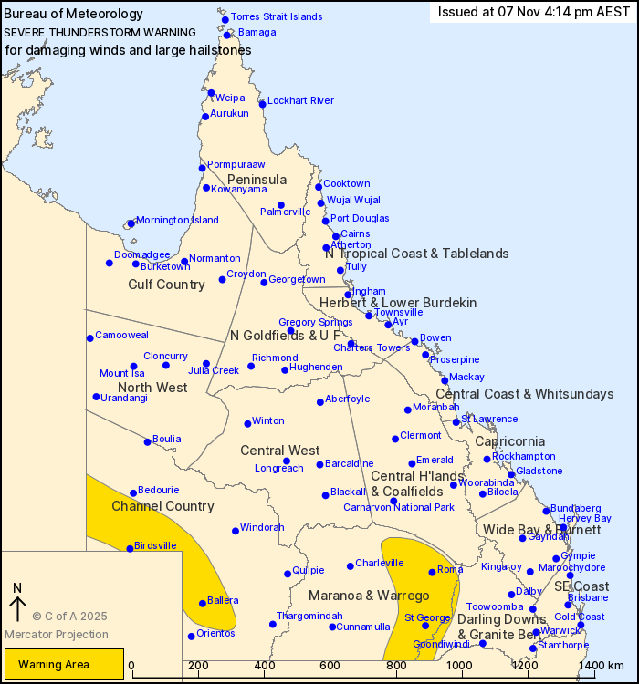Severe thunderstorms are likely to produce damaging winds and large hailstones in the warning area over the next several hours. Locations which may be affected include Roma, Birdsville, St George, Ballera, Mitchell and Dirranbandi.
