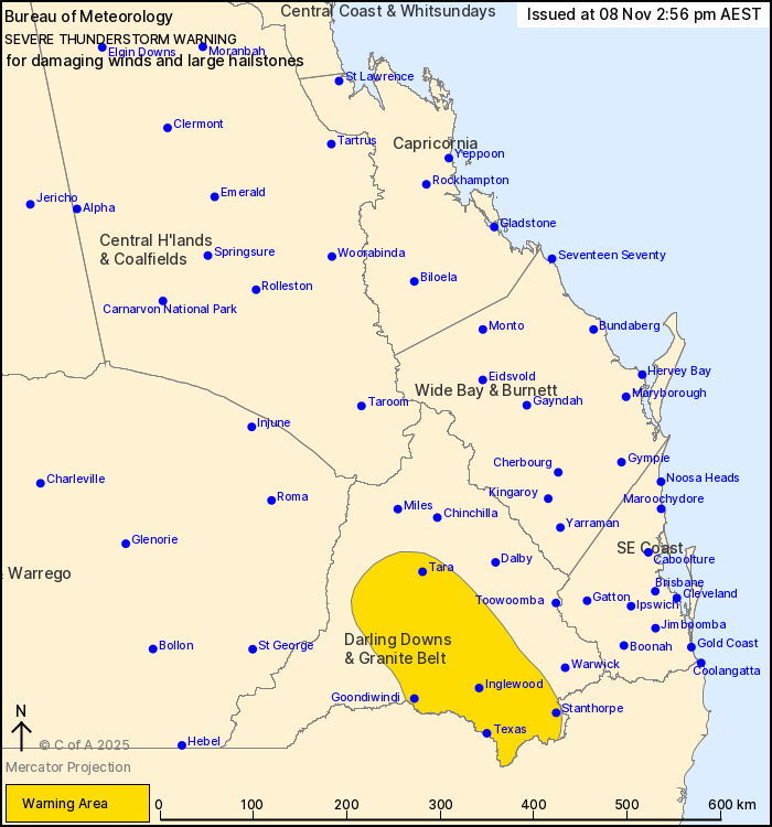 Severe thunderstorms are likely to produce damaging winds and large hailstones in the warning area over the next several hours. Locations which may be affected include Stanthorpe, Goondiwindi, Tara, Inglewood, Texas and Millmerran.