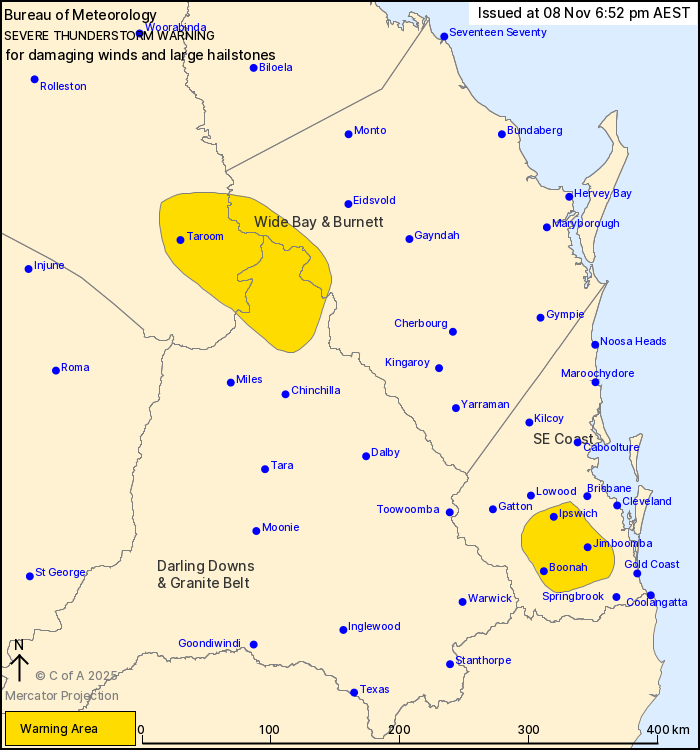 Severe thunderstorms are likely to produce damaging winds and large hailstones over the next several hours in parts of the Central Highlands and Coalfields, Wide Bay and Burnett and Darling Downs and Granite Belt districts. Locations which may be affected include Taroom.