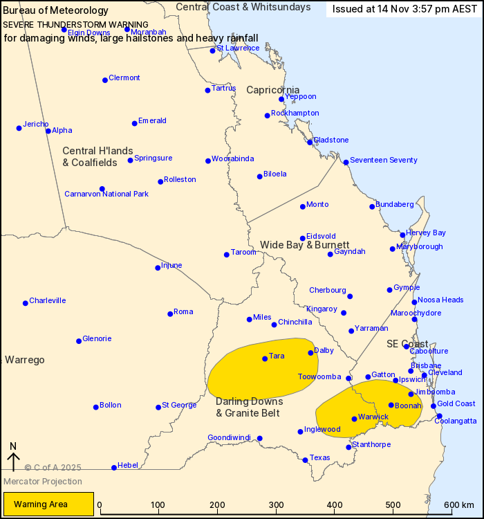 be affected include Warwick, Dalby, Jimboomba, Boonah, Tara and