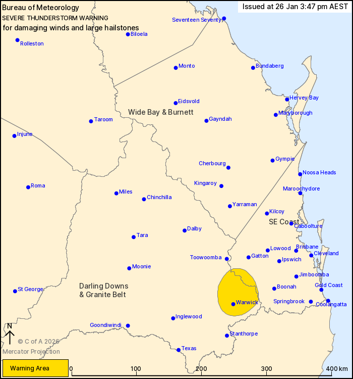 The Bureau of Meteorology warns that, at 3:45 pm, a severe thunderstorm likely to produce damaging winds and large hailstones was detected near Warwick. This thunderstorm is moving towards the north. It is forecast to affect the area northeast of Warwick and the area north of Warwick by 4:15 pm.