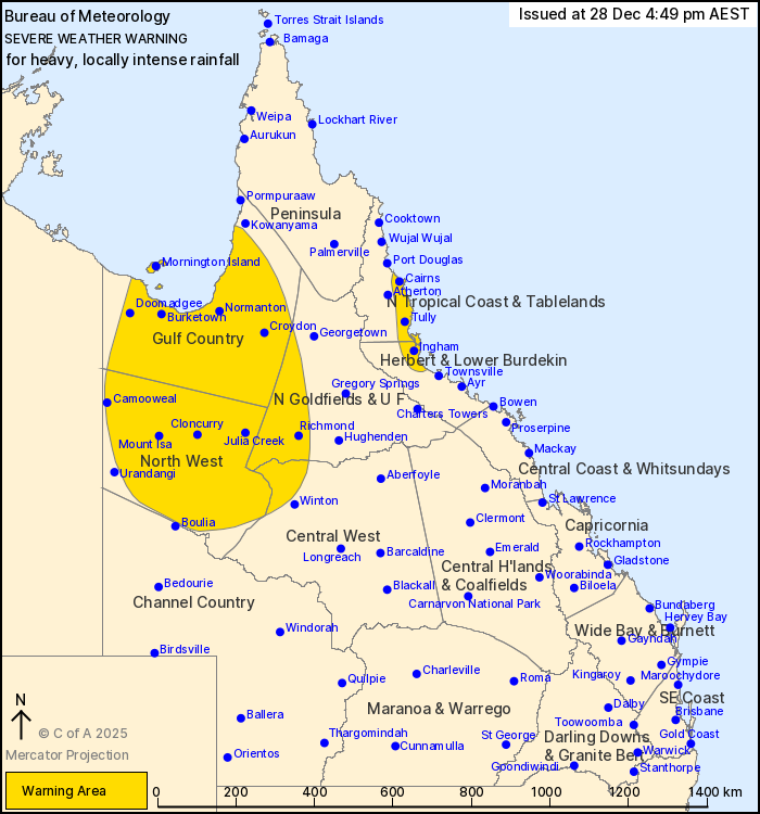 Areas of heavy rainfall about northwest Queensland are forecast to