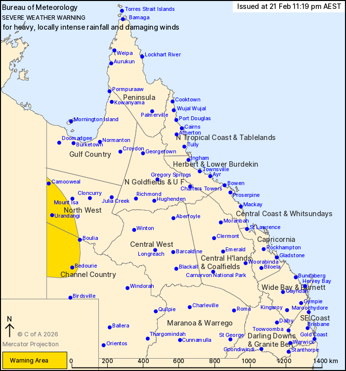 HEAVY TO LOCALLY INTENSE RAINFALL which may lead to DANGEROUS AND LIFE-THREATENING FLASH FLOODING is forecast for parts of the North West and Channel Country. Six-hourly rainfall totals between 60 and 90 mm are likely, with localised falls to 140 mm possible. 24-hourly rainfall totals between 125 and 160 mm are likely, with localised falls to 200 mm possible.