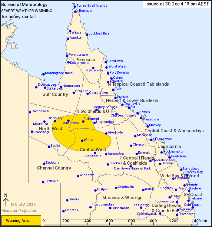 Locations which may be affected include Winton, Cloncurry, Richmond, Julia Creek, Evesham Station, Stamford, Aramac, Muttaburra and Selwyn.