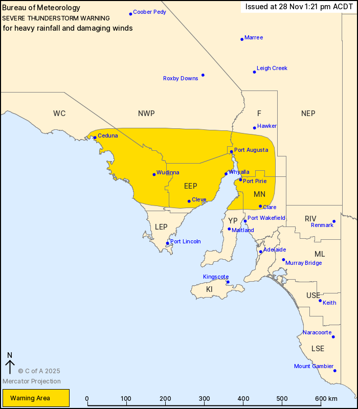 Severe thunderstorms are likely to produce heavy rainfall that may lead to flash flooding and damaging winds in the warning area over the next several hours. Locations which may be affected include Whyalla, Ceduna, Port Augusta, Port Pirie, Clare and Wudinna.