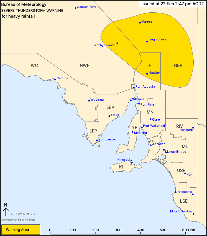 Severe thunderstorms are likely to produce heavy rainfall that may lead to flash flooding in the warning area over the next several hours. Locations which may be affected include Roxby Downs, Leigh Creek, Marree, Hawker, Arkaroola and Olary.