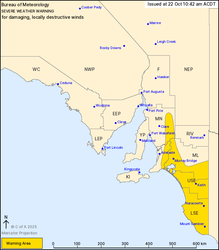 DAMAGING WINDS averaging 60 to 80 km/h with gusts to 100 to 120 km/h are likely about the coast southeast of Robe until early afternoon, with the risk of DESTRUCTIVE WIND GUSTS to 130 km/h.