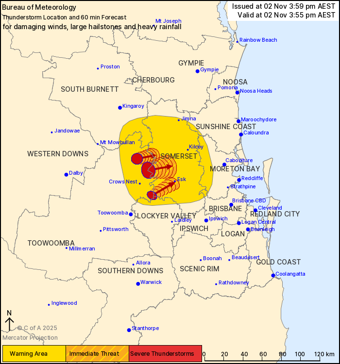 The Bureau of Meteorology warns that, at 3:55 pm, severe