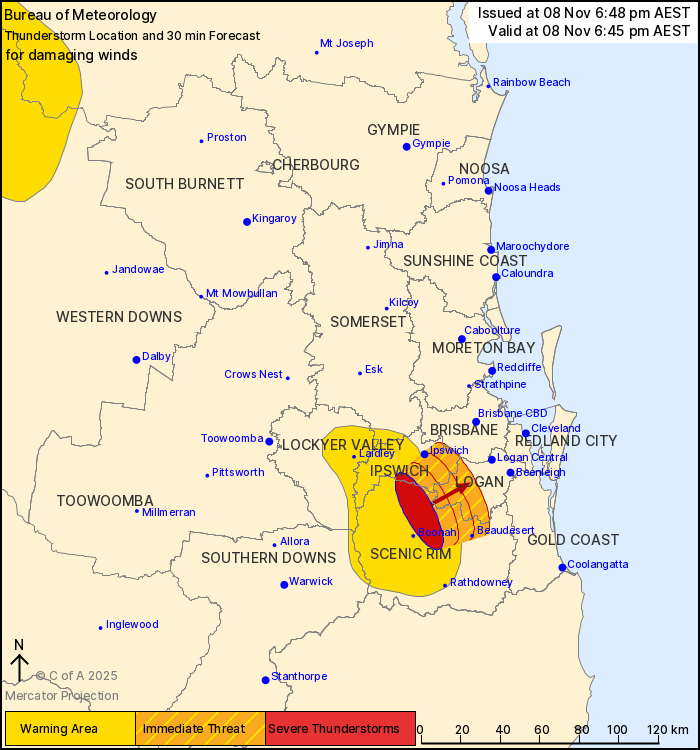 The Bureau of Meteorology warns that, at 6:45 pm, a severe thunderstorm likely to produce damaging winds was detected near the area between Boonah and Beaudesert and Harrisville. This thunderstorm is moving towards the northeast. It is forecast to affect Bundamba Lagoon and the area south of Amberley by 7:00 pm and Ipswich, Beaudesert and Jimboomba by 7:15 pm.
