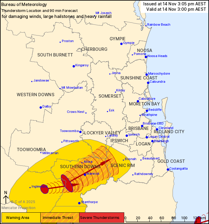 forecast to affect Warwick, Allora and the area south of Warwick by